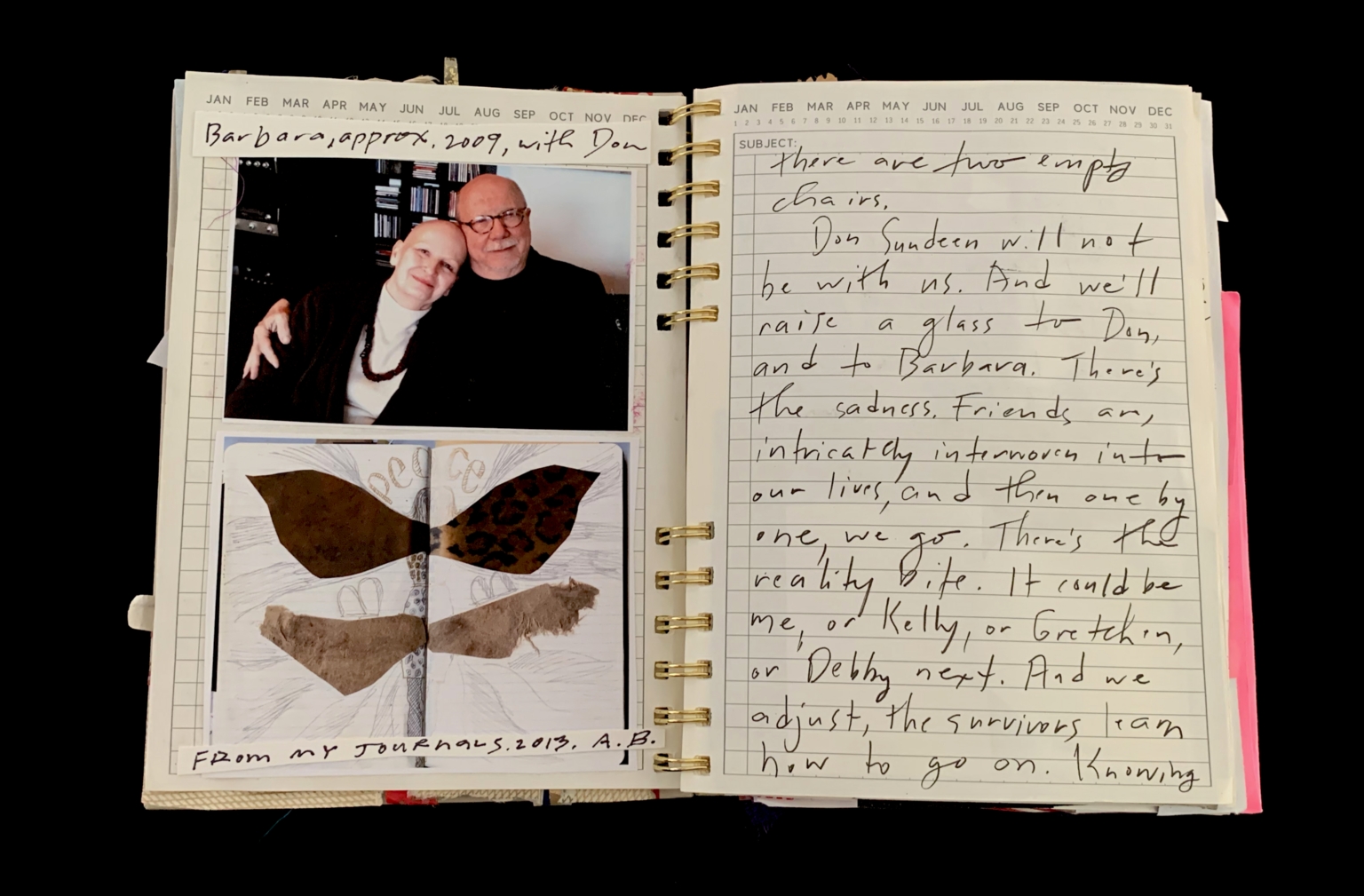 - The page is part of a spiral-bound notebook. On the left side, there is a photograph of two individuals, a man and a woman, smiling and posing together. Below the photograph, there is a piece of fabric with a brown and beige pattern. On the right side, there is handwritten text discussing the loss of a friend named Don Sundeen and the emotional impact of such a loss on the survivors. The text reflects on the inevitability of loss and the process of adjusting to life without a loved one.