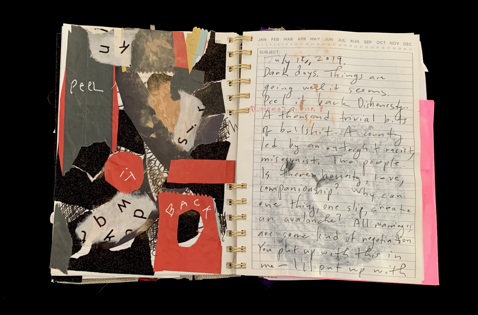 - The page is part of a journal with a spiral binding. The left side of the page is adorned with a collage of abstract shapes, including cut-out letters and numbers, and a red rectangular shape with the word "BACK" written on it. The right side contains handwritten notes dated "July 17, 2019," with entries discussing personal and societal issues, such as "Dank Days," "Things are going well it seems," and reflections on honesty and leadership. The page is partially covered by a pink sticky note.
