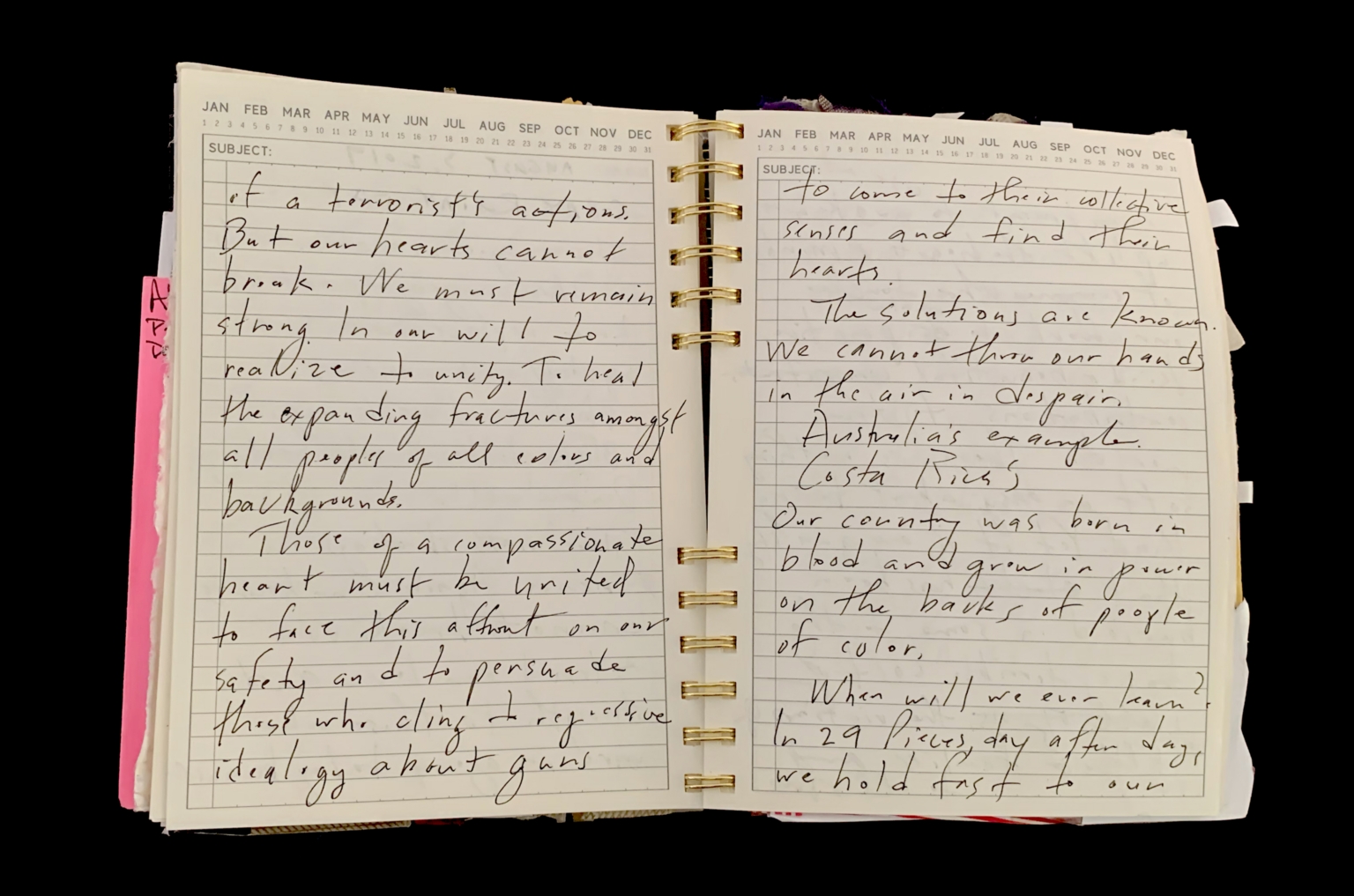 - The image shows an open spiral-bound notebook with handwritten text. The pages are lined and have a grid at the top for organizing months. The handwriting is cursive and appears to be in black ink. There are no visible art, photos, or doodles on the page. The notebook is bound with a pink bookmark on the left side.