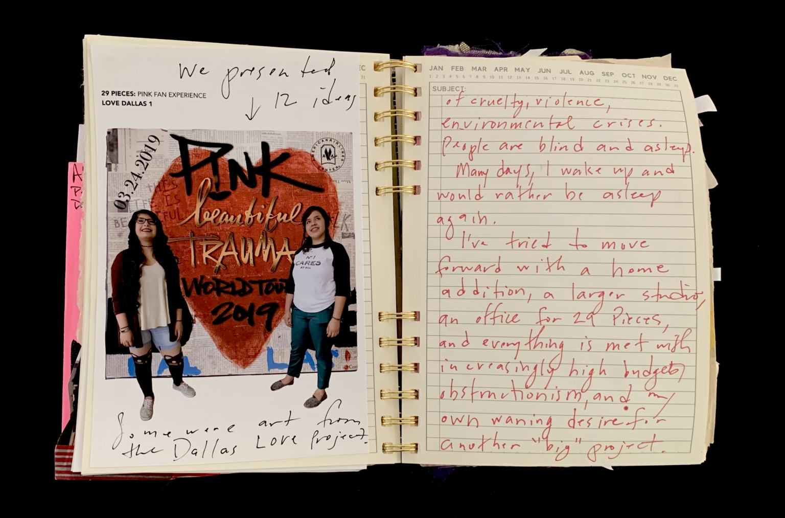 - The page includes a photograph of two individuals standing in front of a promotional poster for Pink's "Beautiful Trauma World Tour 2019." The poster is prominently displayed on the left side of the page. The right side of the page contains handwritten notes in red ink, discussing topics such as cruelty, violence, environmental crises, and personal struggles with projects and desires. The journal is bound with a gold spiral and has a pink bookmark on the left side.