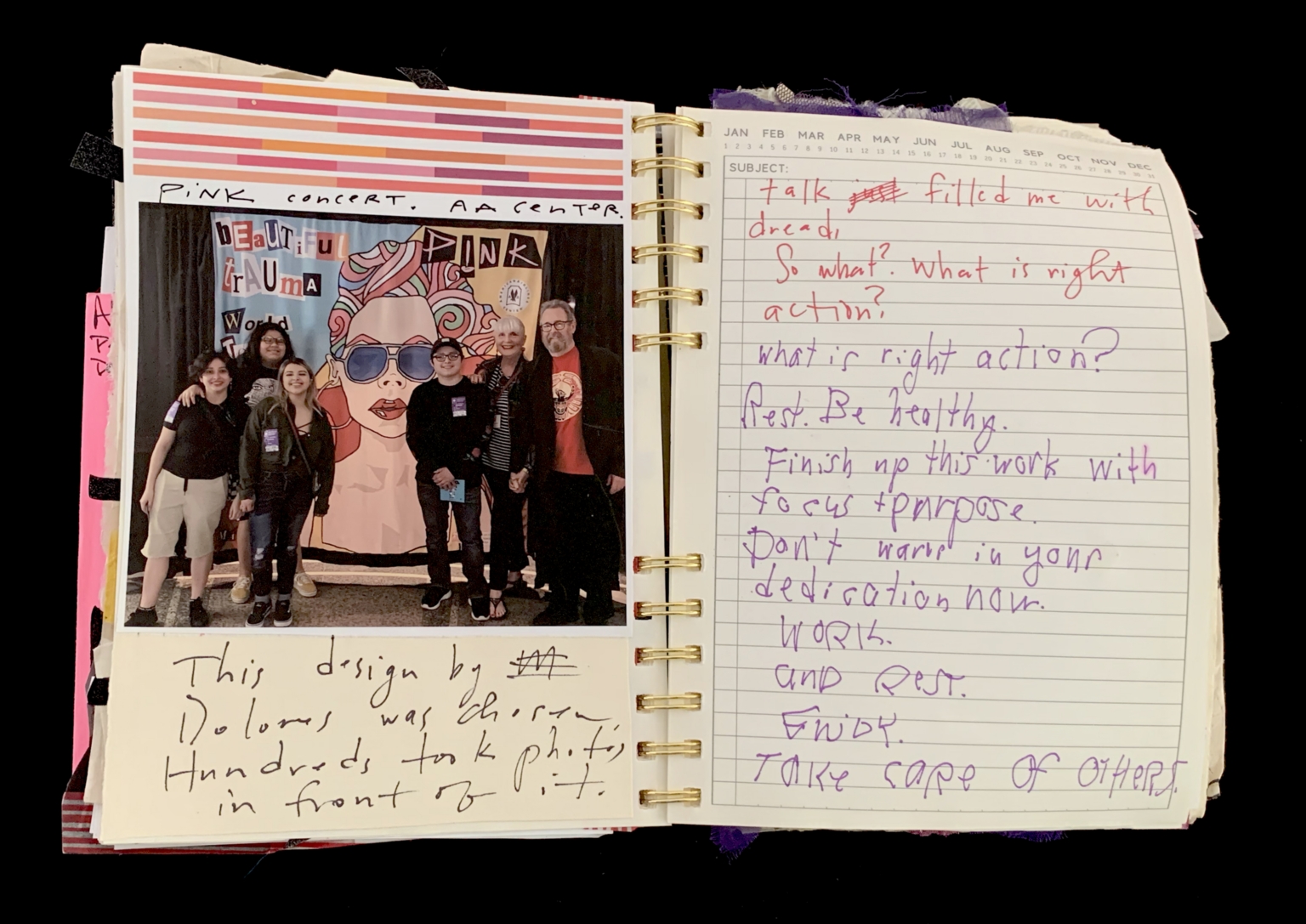 - The left side of the page contains a Polaroid-style photograph of a group of people posing in front of a backdrop featuring the text "Beautiful Trauma" and an illustration of a person with sunglasses. The photo is labeled "Pink concert, AA center." Below the photo, handwritten text notes that a design by Dolores was chosen and hundreds took photos in front of it. The right side of the page is a lined notebook with handwritten notes discussing dread, right action, rest, health, and dedication, with phrases like "Talk filled me with dread," "What is right action?" and "Take care of others."