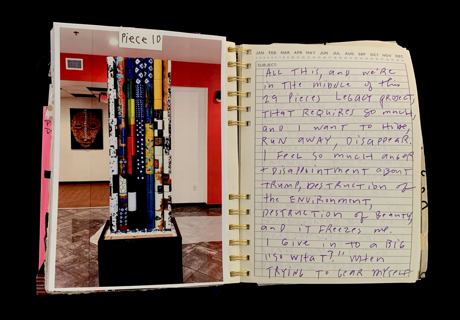 - Right Side: A handwritten entry in a planner. The entry discusses the emotional state of the writer, expressing frustration and anger about environmental destruction and the "Legacy Project." The writer mentions feeling overwhelmed and considering giving up. - Identifier