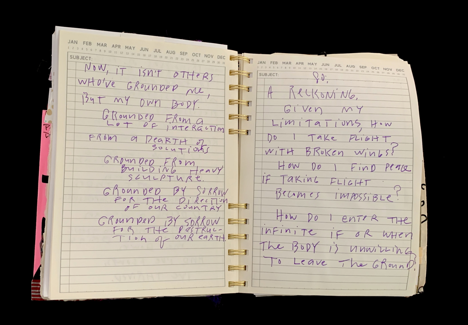- The image shows an open spiral-bound notebook with lined pages. The left page contains a list of reflections written in purple ink, while the right page has a series of questions and reflections also in purple ink. The top of each page has a calendar layout for the months of January through December. There are no visible art, photos, or doodles on the page.
