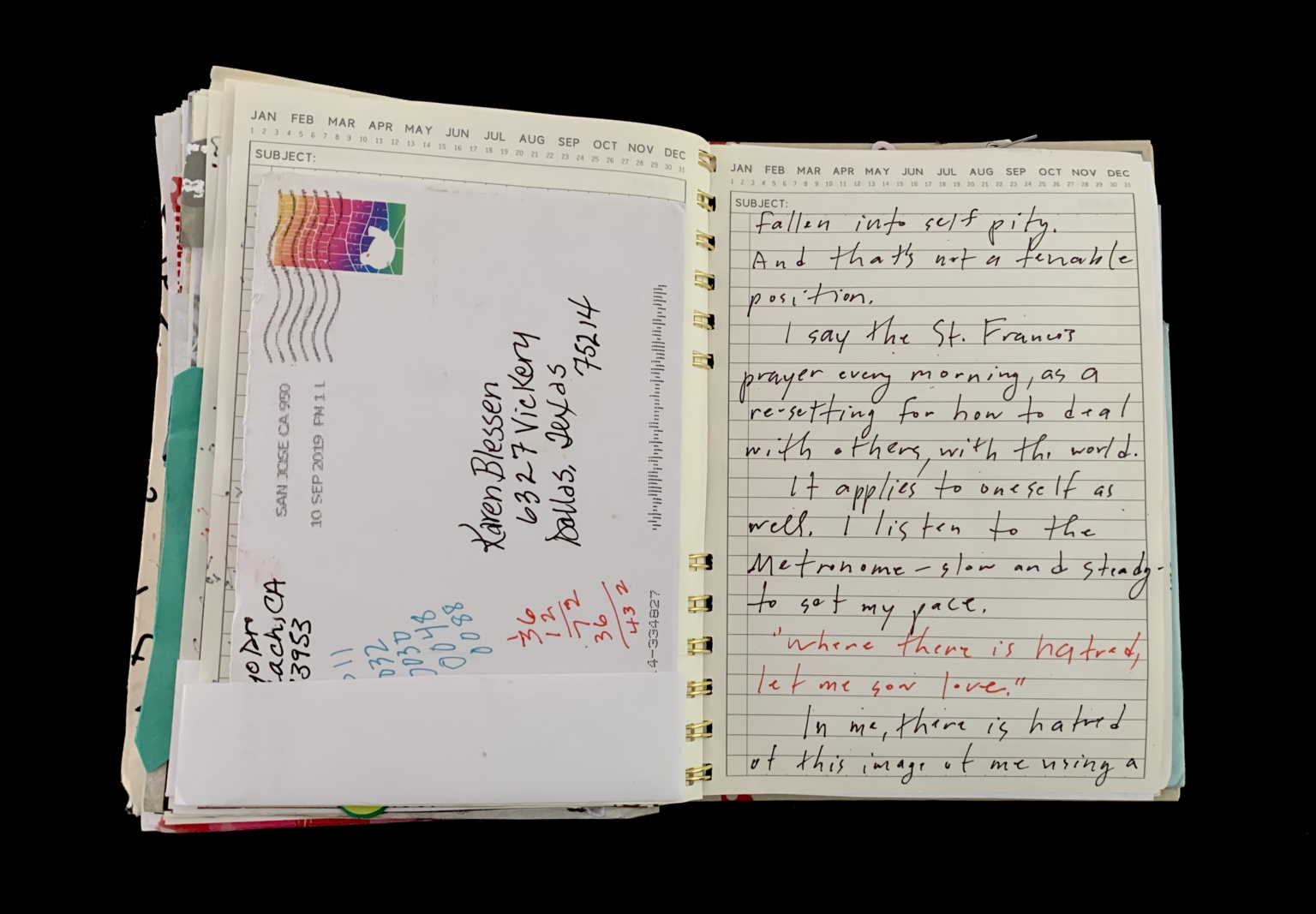 - : The image shows a spiral-bound notebook open to a page with handwritten text. The page includes a calendar at the top, a postcard with a colorful design and postage stamp, and handwritten notes. The postcard is addressed to "Karen Blessen" in Dallas, Texas. The notebook page contains a reflection on self-pity, St. Francis prayer, and a metronome as a metaphor for setting one's pace.