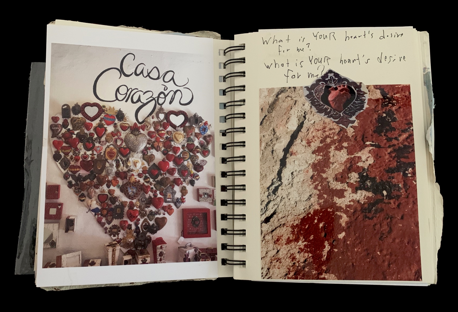 - The left page displays a heart-shaped collage with various heart-shaped objects, including jewelry and decorative items, with the text "Casa Corazón" prominently displayed. The right page shows a textured wall with a red and white pattern, featuring a heart-shaped sticker or decoration in the upper left corner. The text on the right page reads, "What is YOUR heart's desire for me? What is YOUR heart's desire for me?"