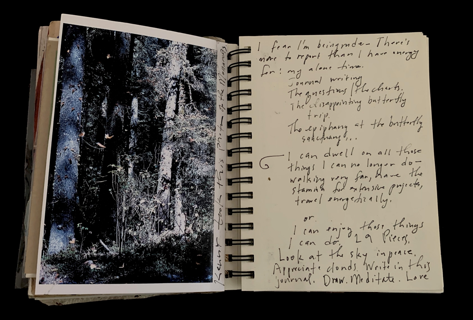 - : The left page displays a photograph of a dense forest with tall trees and a mix of light and shadow, suggesting a natural, serene environment. The right page contains handwritten text discussing feelings of being overwhelmed, reflecting on past experiences, and contemplating the balance between dwelling on limitations and enjoying current abilities. The handwriting is casual and personal, with some underlines and a small doodle of a leaf.