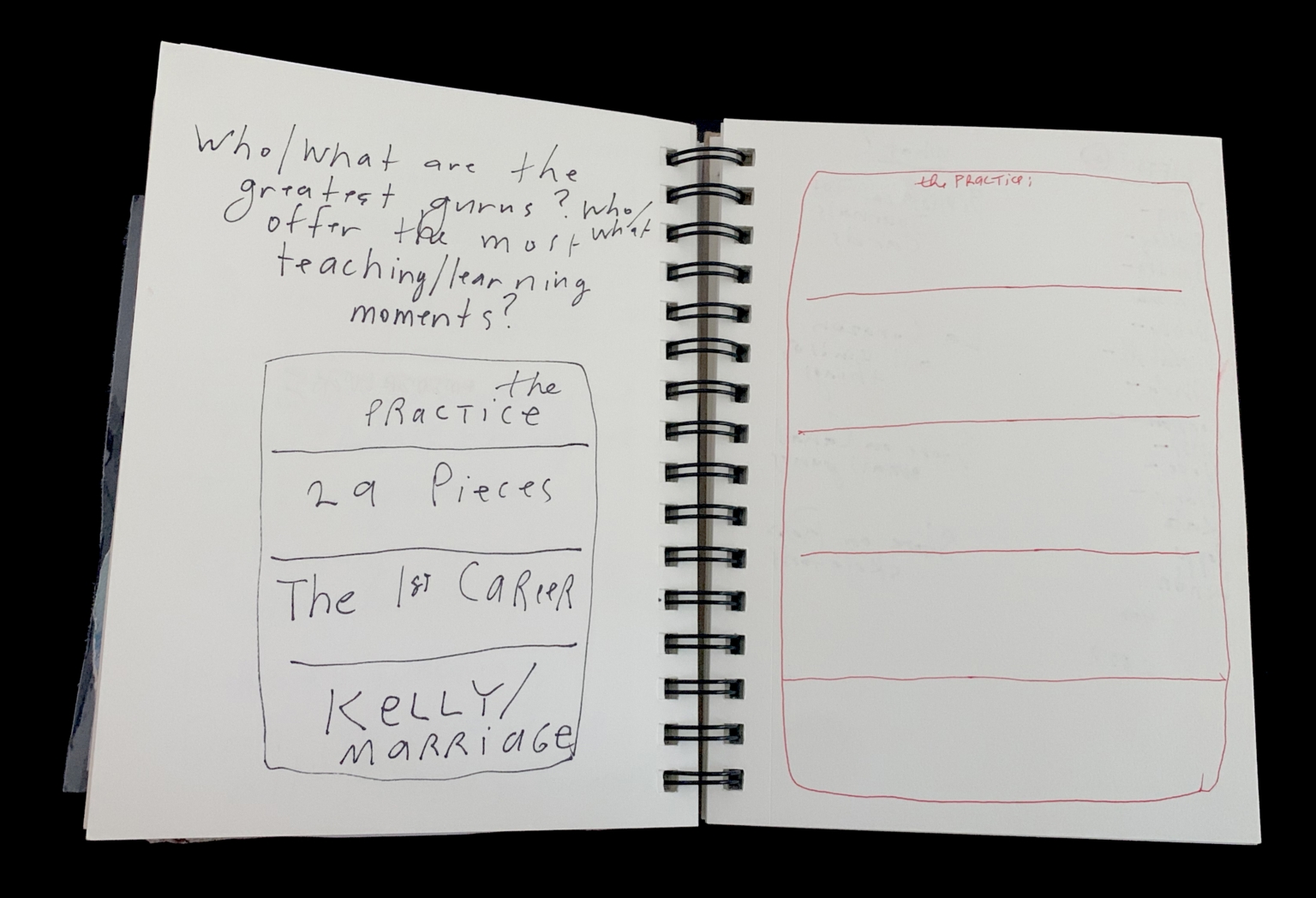 - The image shows an open spiral-bound notebook with white pages. The left page contains handwritten text and a list of topics, while the right page has a red-drawn rectangular box with lines for writing. The text on the left page is in black ink and includes questions about influential figures and moments, followed by a list of topics: "The Practice," "29 Pieces," "The 1st Career," and "Kelly/Marriage." The right page has a red-drawn box with lines, possibly for additional notes or reflections.