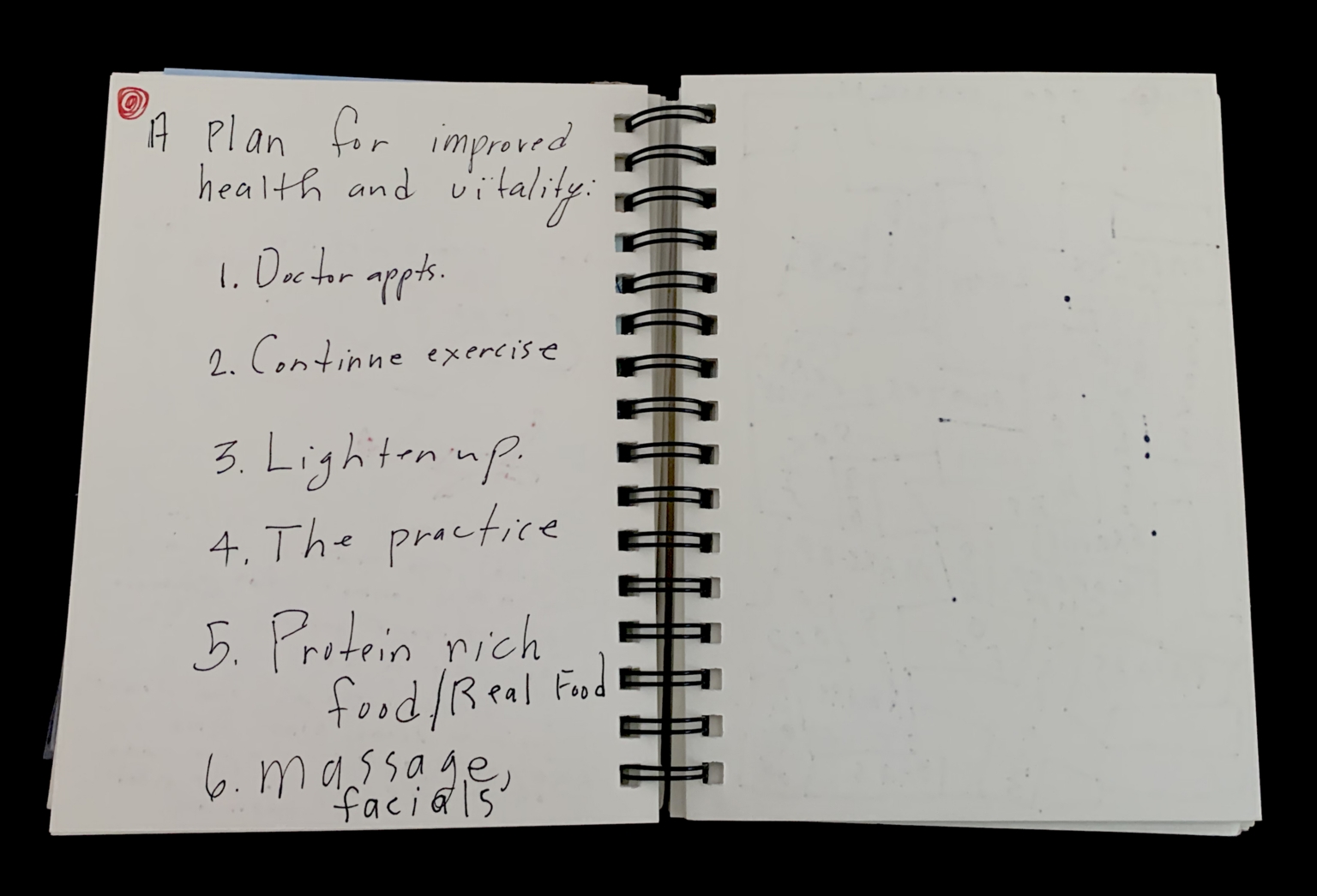 - The image shows a white spiral-bound notebook page with handwritten text. The text is in black ink and appears to be a list of steps for improving health and vitality. The page is clean, with no visible art, photos, or doodles. The right side of the page is blank.