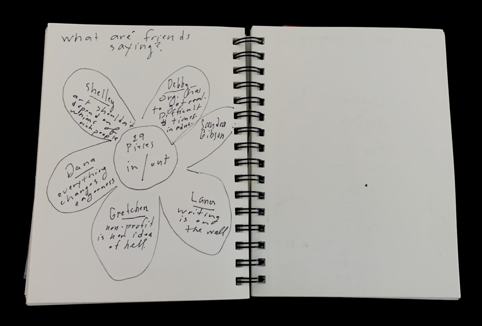 - The image shows an open spiral-bound notebook with a white page on the left and a blank page on the right. The left page contains a hand-drawn mind-map with thought bubbles connected by lines. The mind-map is titled "What are friends saying?" and includes several names and phrases such as "Shelley," "Dana," "Gretchen," "Debby," and "Lana." The thought bubbles contain various handwritten notes, including phrases like "art shouldn't depend on the whims of rich people," "everything changes," "non-profit is not an idea of hell," and "writing is on the wall." The mind-map is centered on the page, with the thought bubbles arranged around a central circle labeled "19 pieces in/out."