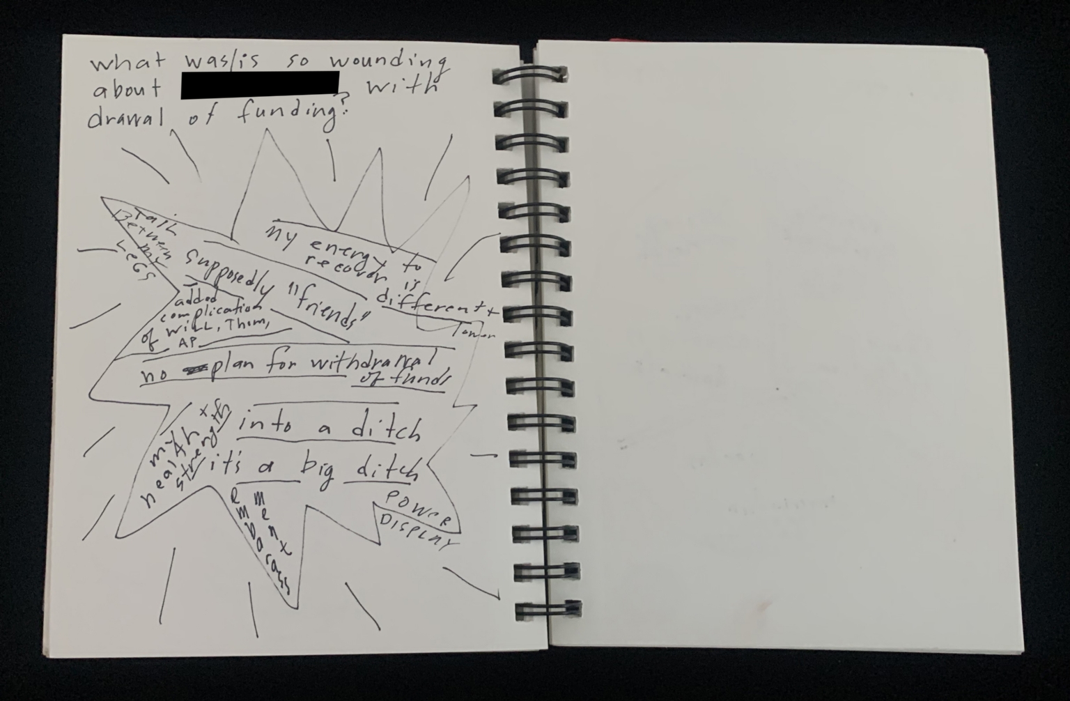 - The image shows an open spiral-bound notebook with a white page on the left and a blank page on the right. The left page contains a handwritten mind-map diagram with various branches and notes. The diagram includes phrases such as "my energy to recover is different," "no plan for withdrawal of funds," and "power display." There are also smaller notes like "trail between supposedly 'friends'" and "added complication of will, them, AP." The handwriting is in black ink, and the diagram is drawn with lines and arrows to connect different ideas.