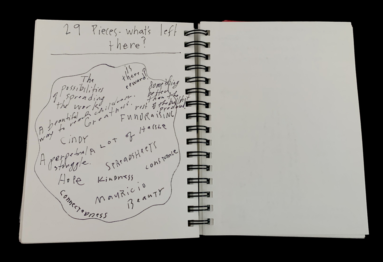 - The image shows an open spiral-bound notebook with a page filled with handwritten text and a doodle. The title at the top reads "29 Pieces - what's left there?" Below the title, there is a large, irregularly shaped doodle that appears to be a map or a cloud. Inside this doodle, various words and phrases are written, such as "The possibilities of spreading the work," "A beautiful children," "A way to reach children," "Fundraising," "Cindy," "A perpetual struggle," "A lot of hassle," "Spreadsheets," "Kindness," "Mauricio," and "Beauty." The right page of the notebook is blank.