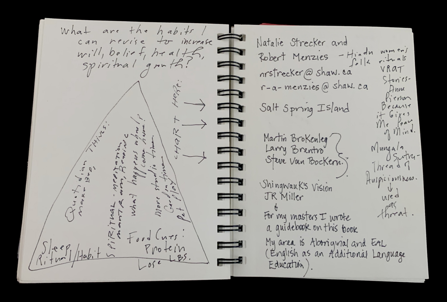 - The image shows an open spiral-bound notebook with handwritten notes. On the left page, there is a diagram with a triangle and various notes around it, including references to "Hindu Thieves," "Spiritual Meditation," "Food Cuts," and "Lose LBS." The right page contains contact information for Natalie Strecker and Robert Menzies, along with references to "Salt Spring Island," "Martin Brokenleg," "Larry Brentro," "Steve Van Bockern," and "Shingwauk's Vision" by JR Miller. There are also notes about Aboriginal and EAL (English as an Additional Language Education) education.