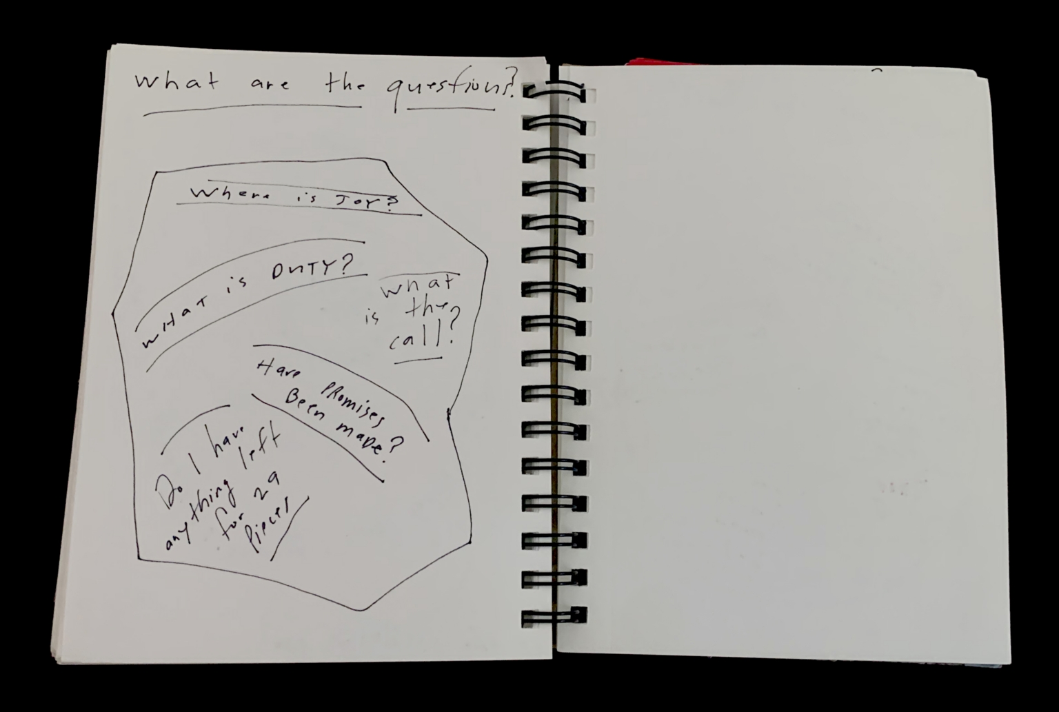 - The image shows an open spiral-bound notebook with a white page on the left and a blank page on the right. The left page contains a hand-drawn sketch of a question tree, with various questions written in a circular and branching pattern. The text is written in black ink. The right page is blank.