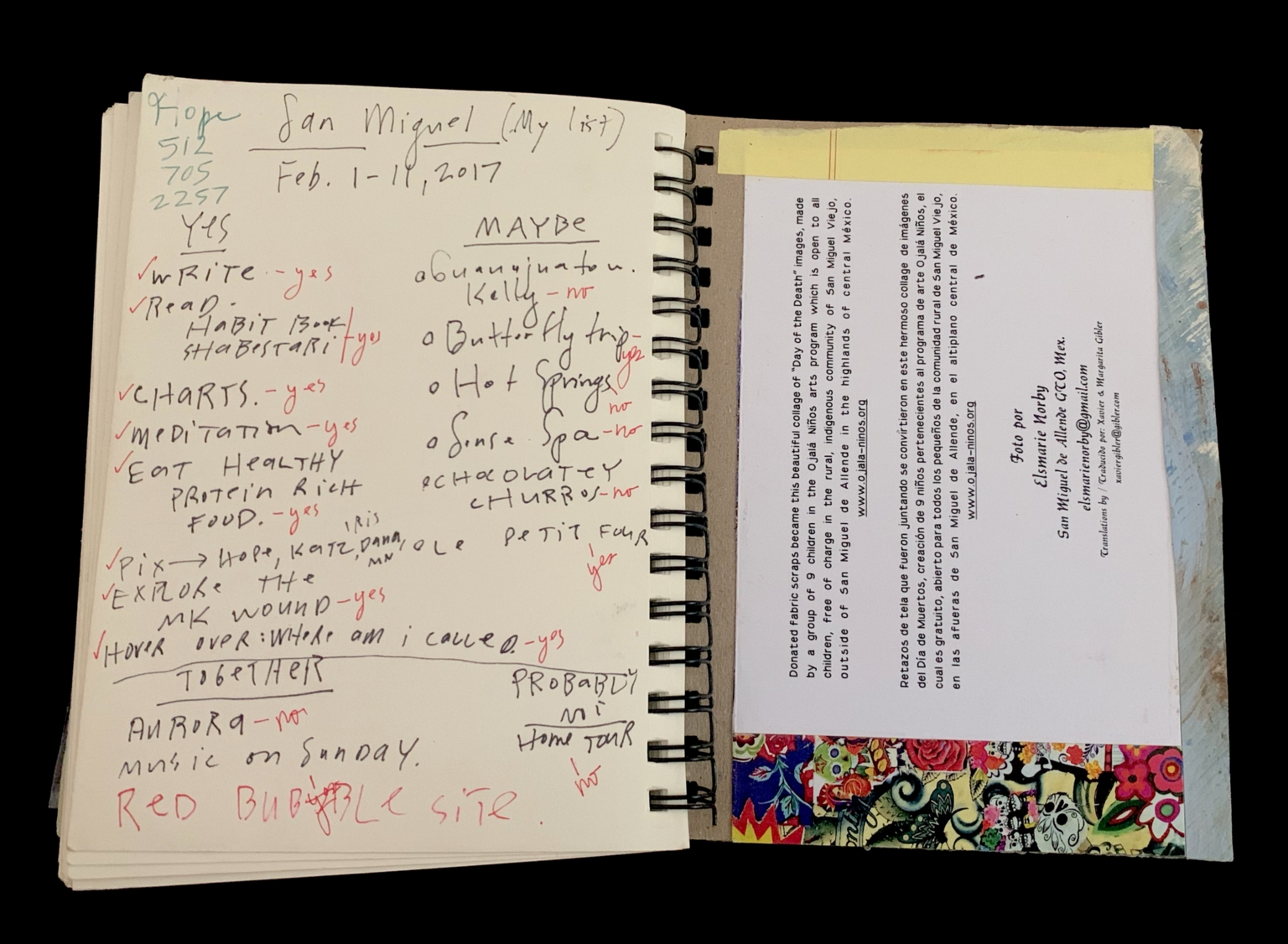- The image shows an open spiral-bound notebook with handwritten notes. The left page contains a list of tasks or goals with checkmarks next to completed items. The right page includes a note about a Day of the Dead collage made by children in San Miguel de Allende, Mexico, and a photo credit to Elsmarie Norby. The notebook has a colorful, patterned bookmark at the bottom.