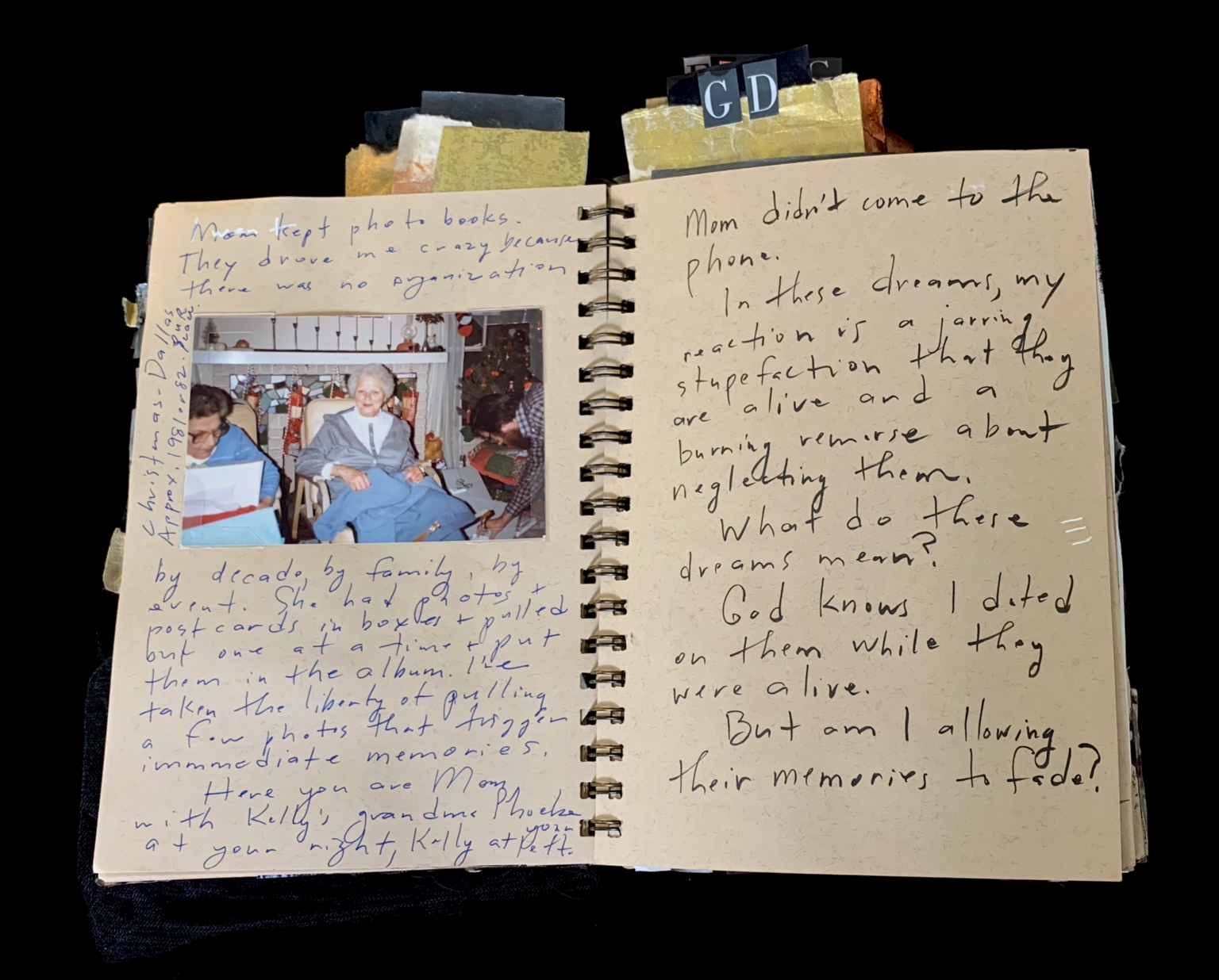 - The image shows a handwritten journal page with a photograph and text. The photograph depicts an elderly woman sitting in a chair, with another person partially visible behind her. The journal page is divided into two sections. The left side contains a photograph and handwritten text, while the right side has more handwritten text. The text appears to be a reflection on memories and family, with a focus on the woman in the photograph. The page is bound with metal rings and has a yellow bookmark at the top.