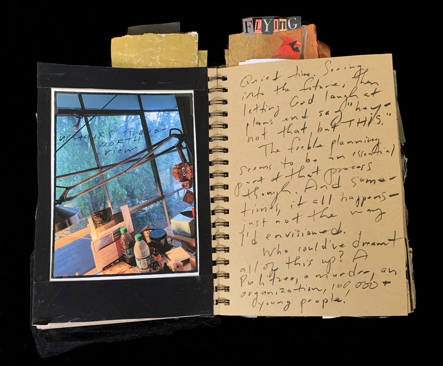 - The left side of the page features a Polaroid photograph of a window with a view of trees and a blue sky. The photo is labeled "WORTHY VIEW." The right side contains handwritten notes with a mix of cursive and print. The top of the page has the word "FLYING" in cut-out letters, with a small red bird image. The notes discuss themes of planning, fate, and unexpected outcomes.