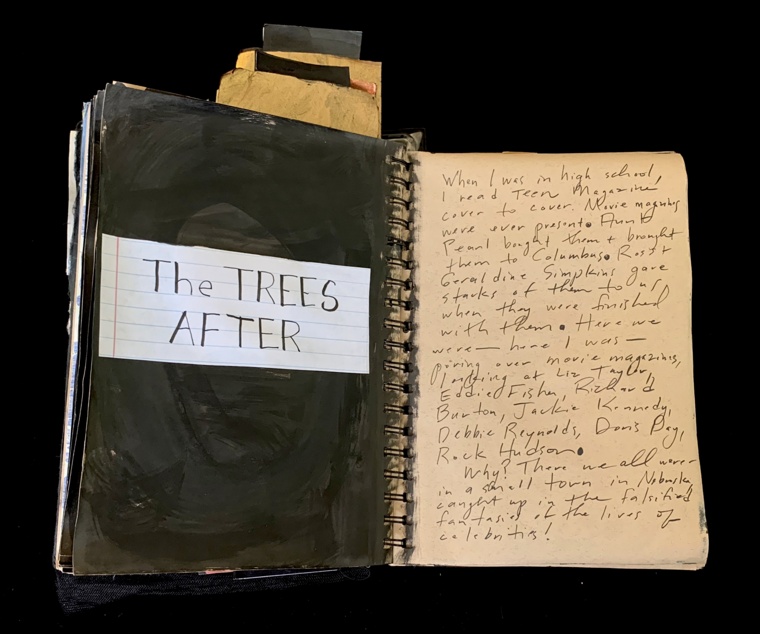 - The image shows an open spiral-bound notebook. The left page is covered with a black plastic sleeve, and the right page contains handwritten text. The title "The TREES AFTER" is written in black ink on lined paper placed over the black sleeve. The right page has a beige background with handwritten text in black ink, describing a personal memory about reading Teen Magazine in high school. The handwriting is neat and legible.