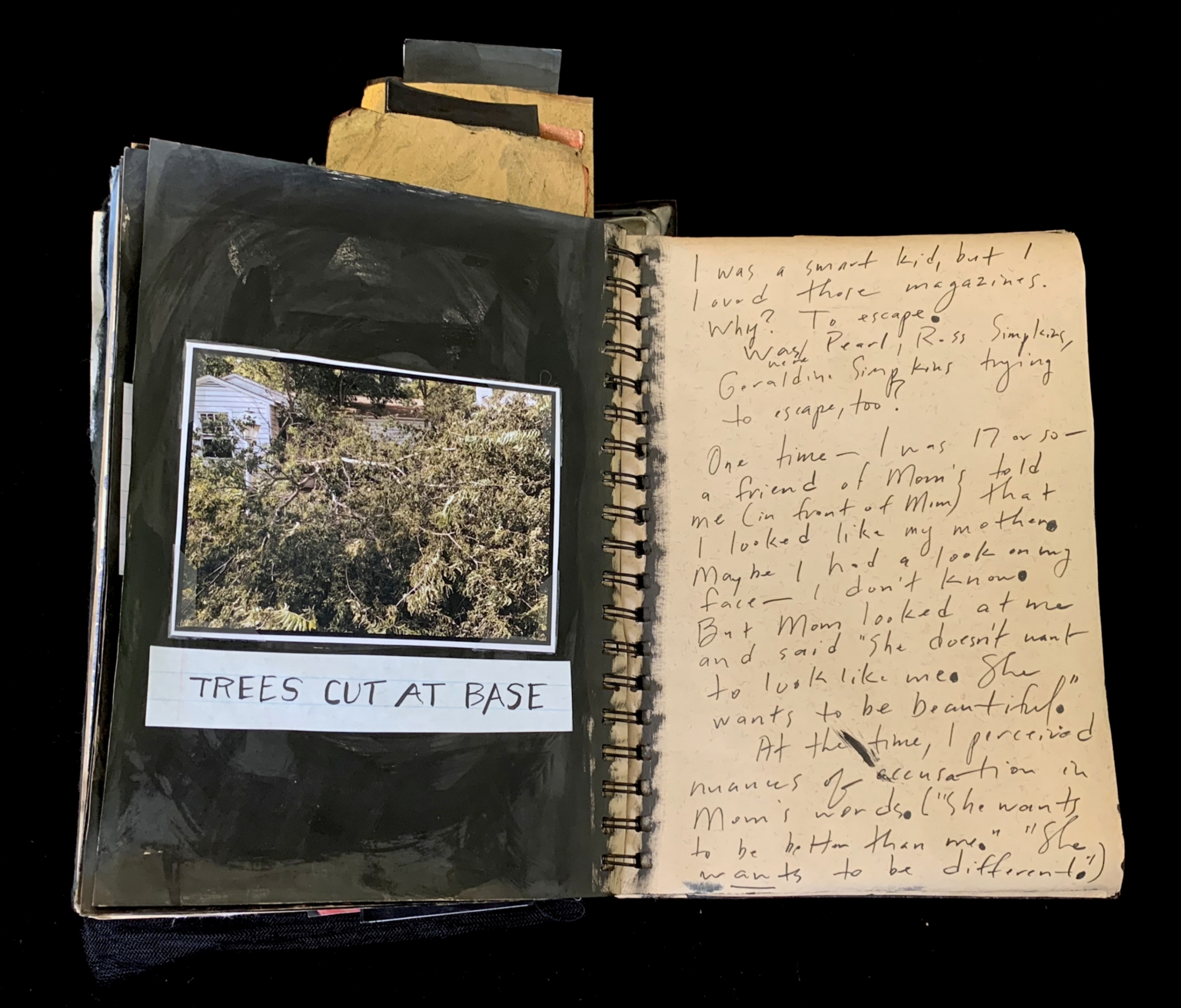 - The page is part of a scrapbook. On the left side, there is a photograph of a tree that has been cut at the base, with the caption "TREES CUT AT BASE" written below it. The right side of the page contains handwritten text, which appears to be a personal reflection or journal entry. The handwriting is in cursive and is somewhat faded, suggesting it might be from an older scrapbook. The text discusses personal memories and reflections on family relationships, specifically mentioning a mother and her desire for her child to be beautiful and different.