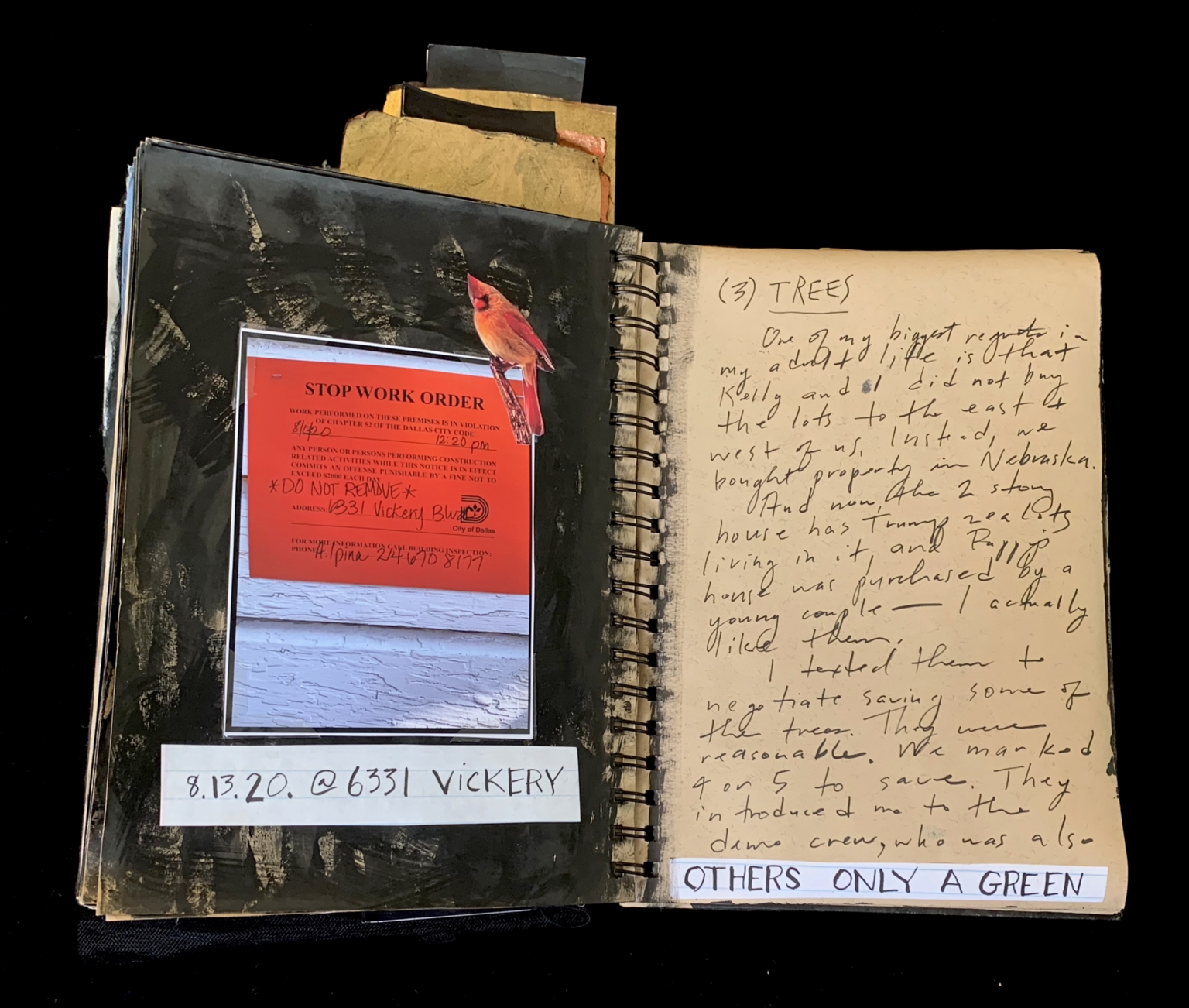 - The image is a collage of various elements. On the left side, there is a printed stop work order with a red background and white text, featuring a red cardinal illustration. Below the stop work order, there is a white label with the text "8.13.20 @ 6331 VICKERY." On the right side, there is a handwritten note on aged paper with the heading "(3) TREES." The note discusses regrets about not buying property to the east and west, and mentions a two-story house with trumpets living in it. The handwriting is in cursive and appears to be in black ink. At the bottom of the note, there is another white label with the text "OTHERS ONLY A GREEN."