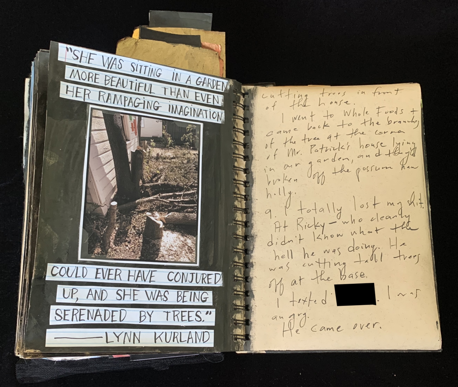 - : The left page contains a photograph of a tree stump with a chainsaw lying on the ground, and a quote from Lynn Kurland overlaid on the image. The right page is filled with handwritten notes discussing a tree-cutting incident and a conversation with someone named Ricky.