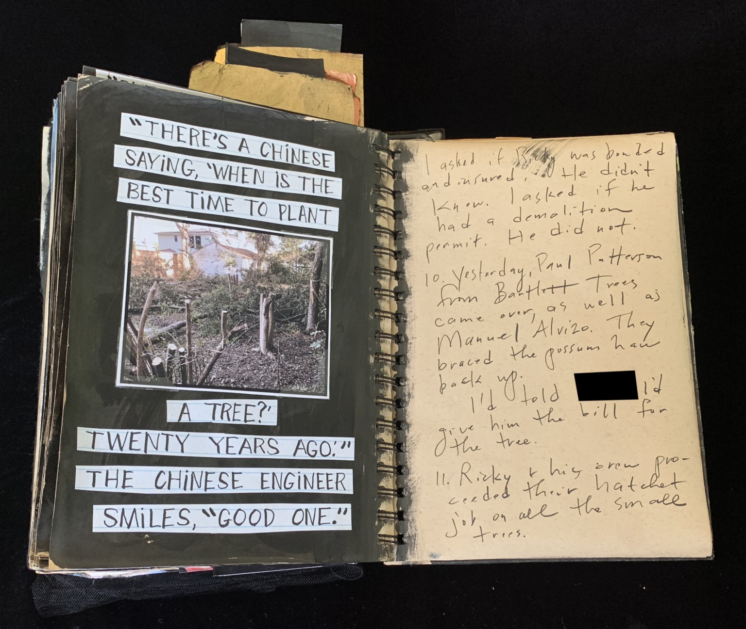 - The page is part of a scrapbook or journal. On the left side, there is a photograph of a forested area with trees and some cleared ground. Overlaid on the photo are white rectangular strips with black text, quoting a Chinese proverb: "There's a Chinese saying, 'When is the best time to plant a tree? Twenty years ago.' The Chinese engineer smiles, 'Good one.'" On the right side, there are handwritten notes in cursive, discussing a conversation about a tree and its removal, mentioning names like Paul Patterson, Manuel Alviso, and Ricky. The handwriting is somewhat messy and includes some corrections and deletions.