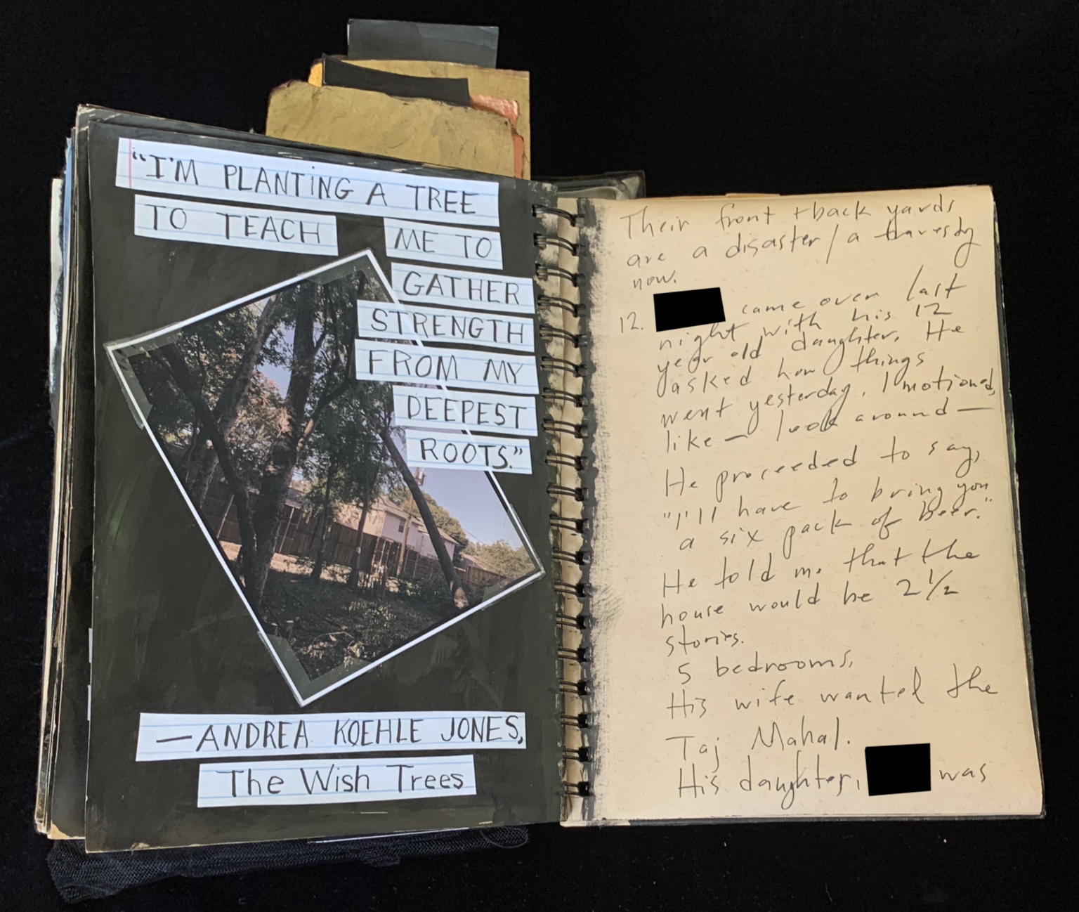 - The image shows a spiral-bound scrapbook page. On the left side, there is a photograph of a tree-lined area, possibly a park or residential area. Overlaid on the photograph is a quote from Andrea Koehle Jones, "I'm planting a tree to teach me to gather strength from my deepest roots." Below the photograph, the author's name and the title "The Wish Trees" are written. On the right side of the page, there are handwritten notes discussing a conversation about a house and its features, mentioning a six-pack of beer, two and a half stories, five bedrooms, and a desire for the Taj Mahal. The handwriting is partially obscured by blacked-out sections.
