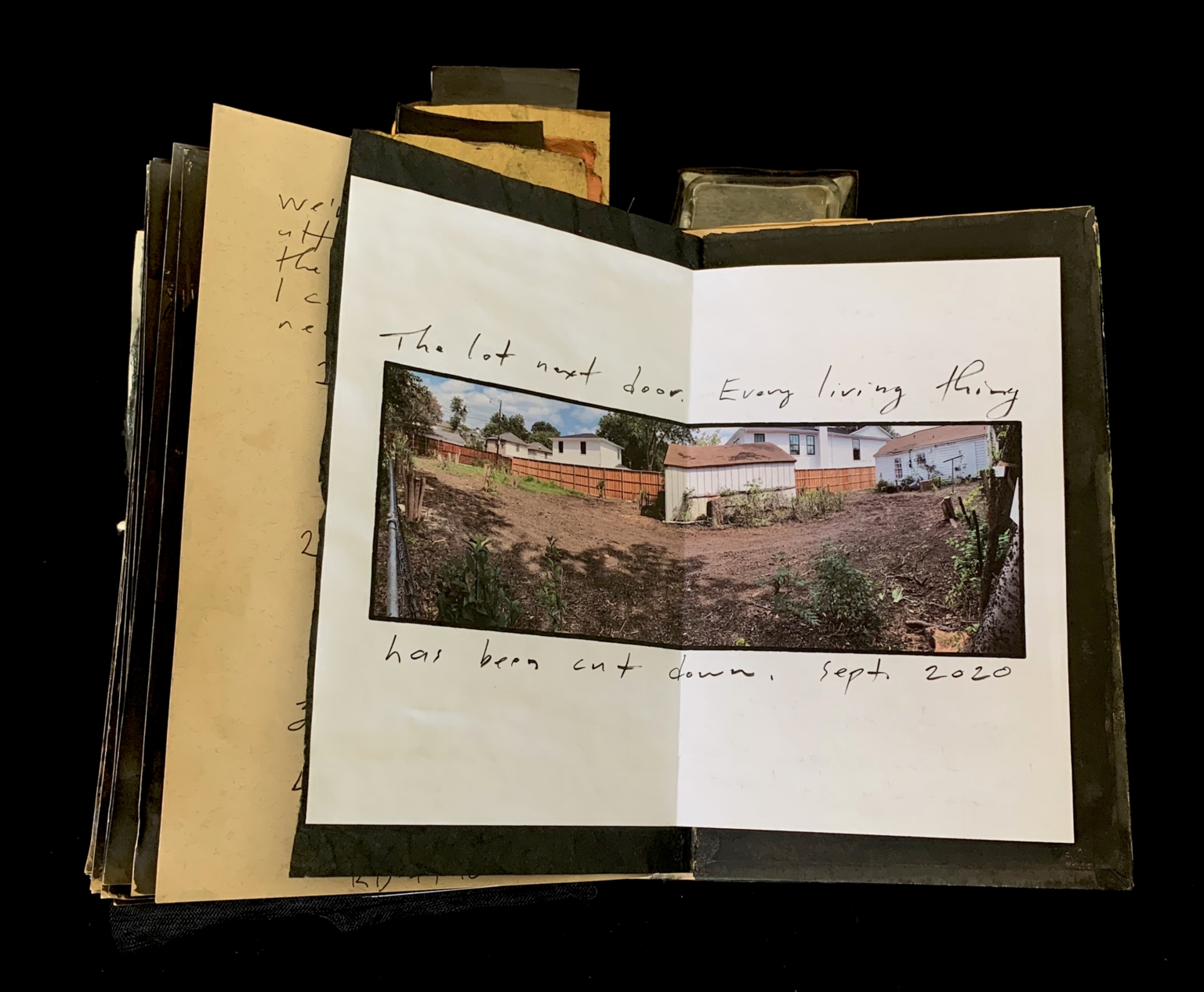 - The image shows a photograph of a residential lot next door, with a handwritten note overlaid on the photo. The note reads, "The lot next door. Every living thing has been cut down. Sept. 2020." The photograph itself depicts a cleared lot with some remnants of vegetation and a fence. The surrounding area includes houses and a clear sky. The page appears to be part of a scrapbook or journal, with other pages and photographs visible in the background.