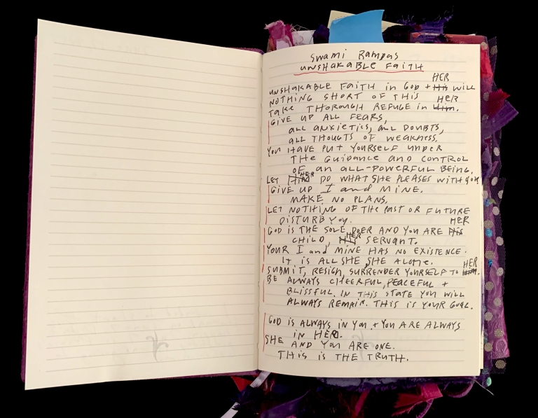 - Purple; Prince; June 7; Blank journal; Barnes and Noble; 2016–2017; Trump election; 29 Pieces; Funding crisis; Board realities; Come to Jesus moment; Remote work; Gut punches; Dana moves; Emotional loss; Political uncertainty; Life necessities; Calling the angels; Unshakeable faith; State of Contentment; Sacred feminine; Tramadol; Pleasing Daddy; Embodying HER; Yayoi Kusama; Frida Kahlo; Missing Barbara Boster; Mantrams for Trump; Anger chart; Charlottesville; Compassionate Path; Critical Path; Chronic hip pain; Angst and joy; Friendship and forgiveness; NYC trip; Times Square BID; Women artists; Left vs. right hand writing; No backyard studio