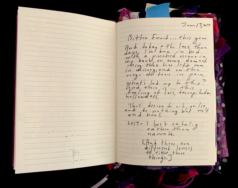 - Purple; Prince; June 7; Blank journal; Barnes and Noble; 2016–2017; Trump election; 29 Pieces; Funding crisis; Board realities; Come to Jesus moment; Remote work; Gut punches; Dana moves; Emotional loss; Political uncertainty; Life necessities; Calling the angels; Unshakeable faith; State of Contentment; Sacred feminine; Tramadol; Pleasing Daddy; Embodying HER; Yayoi Kusama; Frida Kahlo; Missing Barbara Boster; Mantrams for Trump; Anger chart; Charlottesville; Compassionate Path; Critical Path; Chronic hip pain; Angst and joy; Friendship and forgiveness; NYC trip; Times Square BID; Women artists; Left vs. right hand writing; No backyard studio