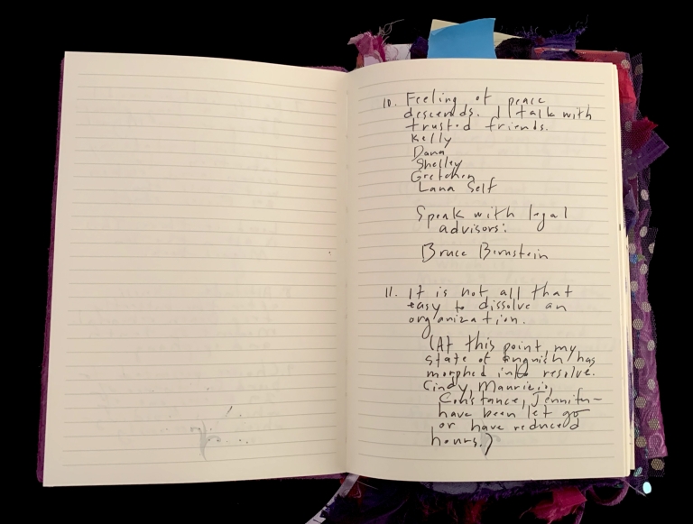 - Purple; Prince; June 7; Blank journal; Barnes and Noble; 2016–2017; Trump election; 29 Pieces; Funding crisis; Board realities; Come to Jesus moment; Remote work; Gut punches; Dana moves; Emotional loss; Political uncertainty; Life necessities; Calling the angels; Unshakeable faith; State of Contentment; Sacred feminine; Tramadol; Pleasing Daddy; Embodying HER; Yayoi Kusama; Frida Kahlo; Missing Barbara Boster; Mantrams for Trump; Anger chart; Charlottesville; Compassionate Path; Critical Path; Chronic hip pain; Angst and joy; Friendship and forgiveness; NYC trip; Times Square BID; Women artists; Left vs. right hand writing; No backyard studio