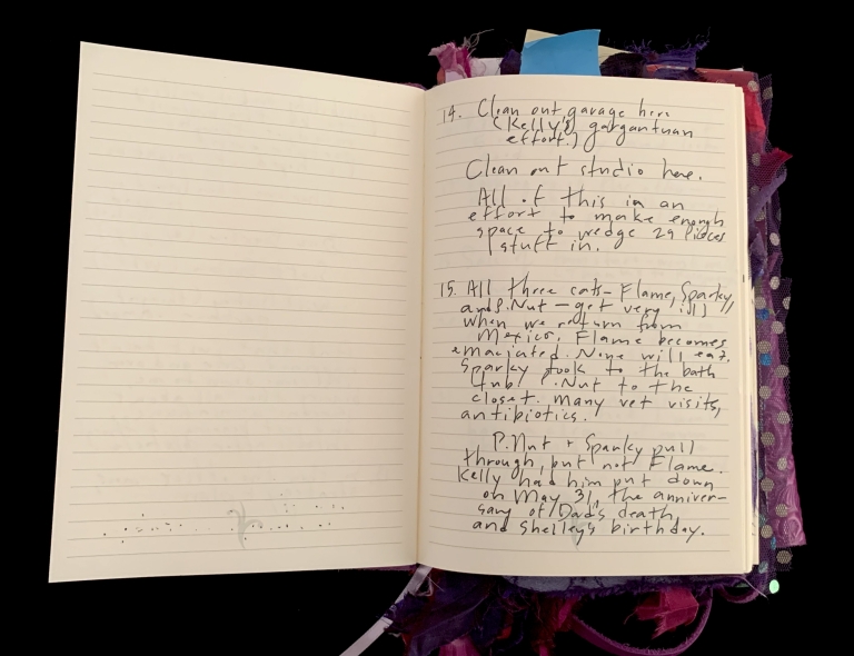 - Purple; Prince; June 7; Blank journal; Barnes and Noble; 2016–2017; Trump election; 29 Pieces; Funding crisis; Board realities; Come to Jesus moment; Remote work; Gut punches; Dana moves; Emotional loss; Political uncertainty; Life necessities; Calling the angels; Unshakeable faith; State of Contentment; Sacred feminine; Tramadol; Pleasing Daddy; Embodying HER; Yayoi Kusama; Frida Kahlo; Missing Barbara Boster; Mantrams for Trump; Anger chart; Charlottesville; Compassionate Path; Critical Path; Chronic hip pain; Angst and joy; Friendship and forgiveness; NYC trip; Times Square BID; Women artists; Left vs. right hand writing; No backyard studio