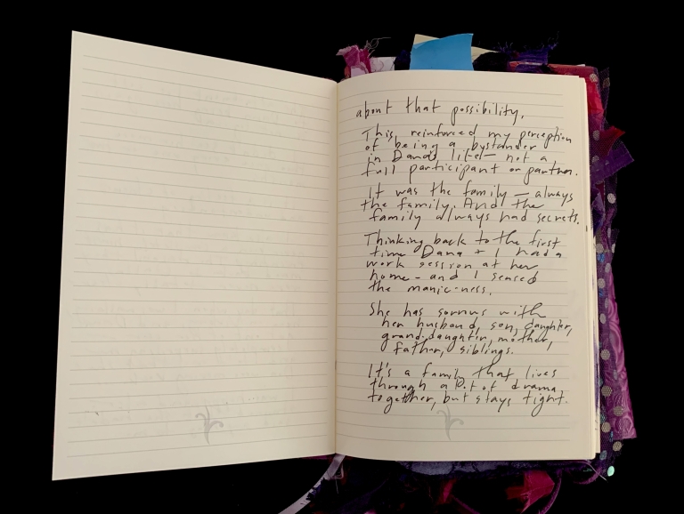 - Purple; Prince; June 7; Blank journal; Barnes and Noble; 2016–2017; Trump election; 29 Pieces; Funding crisis; Board realities; Come to Jesus moment; Remote work; Gut punches; Dana moves; Emotional loss; Political uncertainty; Life necessities; Calling the angels; Unshakeable faith; State of Contentment; Sacred feminine; Tramadol; Pleasing Daddy; Embodying HER; Yayoi Kusama; Frida Kahlo; Missing Barbara Boster; Mantrams for Trump; Anger chart; Charlottesville; Compassionate Path; Critical Path; Chronic hip pain; Angst and joy; Friendship and forgiveness; NYC trip; Times Square BID; Women artists; Left vs. right hand writing; No backyard studio