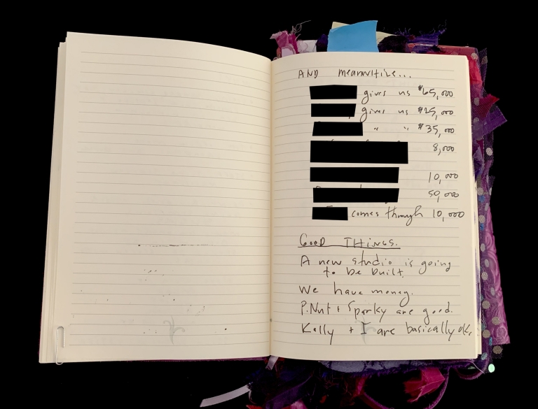 - Purple; Prince; June 7; Blank journal; Barnes and Noble; 2016–2017; Trump election; 29 Pieces; Funding crisis; Board realities; Come to Jesus moment; Remote work; Gut punches; Dana moves; Emotional loss; Political uncertainty; Life necessities; Calling the angels; Unshakeable faith; State of Contentment; Sacred feminine; Tramadol; Pleasing Daddy; Embodying HER; Yayoi Kusama; Frida Kahlo; Missing Barbara Boster; Mantrams for Trump; Anger chart; Charlottesville; Compassionate Path; Critical Path; Chronic hip pain; Angst and joy; Friendship and forgiveness; NYC trip; Times Square BID; Women artists; Left vs. right hand writing; No backyard studio