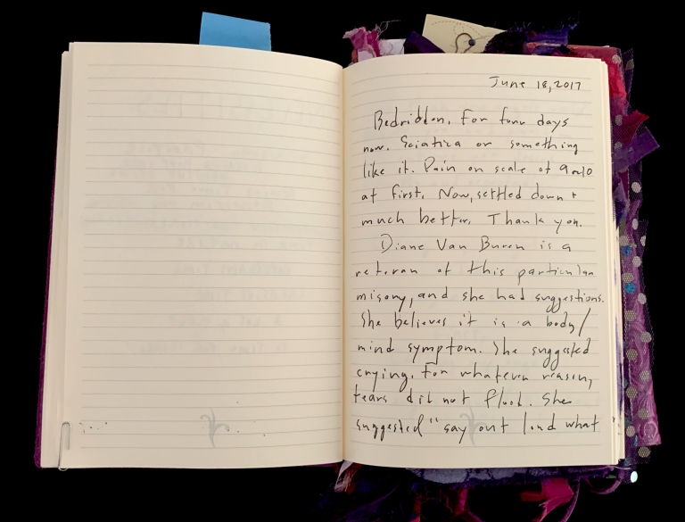 - Purple; Prince; June 7; Blank journal; Barnes and Noble; 2016–2017; Trump election; 29 Pieces; Funding crisis; Board realities; Come to Jesus moment; Remote work; Gut punches; Dana moves; Emotional loss; Political uncertainty; Life necessities; Calling the angels; Unshakeable faith; State of Contentment; Sacred feminine; Tramadol; Pleasing Daddy; Embodying HER; Yayoi Kusama; Frida Kahlo; Missing Barbara Boster; Mantrams for Trump; Anger chart; Charlottesville; Compassionate Path; Critical Path; Chronic hip pain; Angst and joy; Friendship and forgiveness; NYC trip; Times Square BID; Women artists; Left vs. right hand writing; No backyard studio