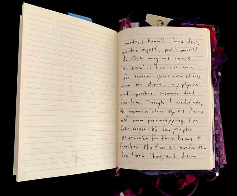 - Purple; Prince; June 7; Blank journal; Barnes and Noble; 2016–2017; Trump election; 29 Pieces; Funding crisis; Board realities; Come to Jesus moment; Remote work; Gut punches; Dana moves; Emotional loss; Political uncertainty; Life necessities; Calling the angels; Unshakeable faith; State of Contentment; Sacred feminine; Tramadol; Pleasing Daddy; Embodying HER; Yayoi Kusama; Frida Kahlo; Missing Barbara Boster; Mantrams for Trump; Anger chart; Charlottesville; Compassionate Path; Critical Path; Chronic hip pain; Angst and joy; Friendship and forgiveness; NYC trip; Times Square BID; Women artists; Left vs. right hand writing; No backyard studio