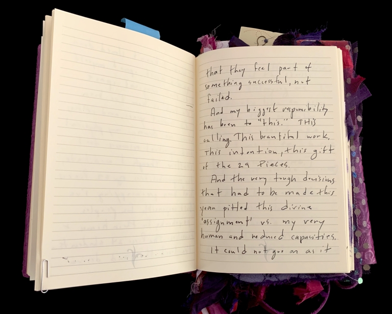 - Purple; Prince; June 7; Blank journal; Barnes and Noble; 2016–2017; Trump election; 29 Pieces; Funding crisis; Board realities; Come to Jesus moment; Remote work; Gut punches; Dana moves; Emotional loss; Political uncertainty; Life necessities; Calling the angels; Unshakeable faith; State of Contentment; Sacred feminine; Tramadol; Pleasing Daddy; Embodying HER; Yayoi Kusama; Frida Kahlo; Missing Barbara Boster; Mantrams for Trump; Anger chart; Charlottesville; Compassionate Path; Critical Path; Chronic hip pain; Angst and joy; Friendship and forgiveness; NYC trip; Times Square BID; Women artists; Left vs. right hand writing; No backyard studio
