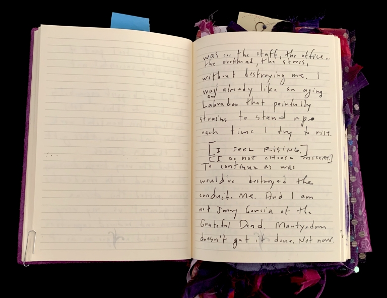 - Purple; Prince; June 7; Blank journal; Barnes and Noble; 2016–2017; Trump election; 29 Pieces; Funding crisis; Board realities; Come to Jesus moment; Remote work; Gut punches; Dana moves; Emotional loss; Political uncertainty; Life necessities; Calling the angels; Unshakeable faith; State of Contentment; Sacred feminine; Tramadol; Pleasing Daddy; Embodying HER; Yayoi Kusama; Frida Kahlo; Missing Barbara Boster; Mantrams for Trump; Anger chart; Charlottesville; Compassionate Path; Critical Path; Chronic hip pain; Angst and joy; Friendship and forgiveness; NYC trip; Times Square BID; Women artists; Left vs. right hand writing; No backyard studio