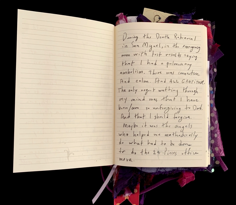 - Purple; Prince; June 7; Blank journal; Barnes and Noble; 2016–2017; Trump election; 29 Pieces; Funding crisis; Board realities; Come to Jesus moment; Remote work; Gut punches; Dana moves; Emotional loss; Political uncertainty; Life necessities; Calling the angels; Unshakeable faith; State of Contentment; Sacred feminine; Tramadol; Pleasing Daddy; Embodying HER; Yayoi Kusama; Frida Kahlo; Missing Barbara Boster; Mantrams for Trump; Anger chart; Charlottesville; Compassionate Path; Critical Path; Chronic hip pain; Angst and joy; Friendship and forgiveness; NYC trip; Times Square BID; Women artists; Left vs. right hand writing; No backyard studio