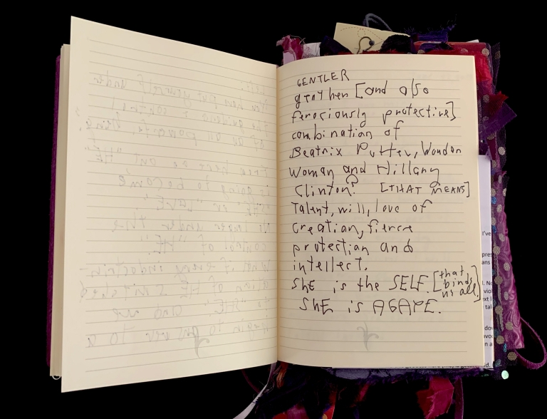 - Purple; Prince; June 7; Blank journal; Barnes and Noble; 2016–2017; Trump election; 29 Pieces; Funding crisis; Board realities; Come to Jesus moment; Remote work; Gut punches; Dana moves; Emotional loss; Political uncertainty; Life necessities; Calling the angels; Unshakeable faith; State of Contentment; Sacred feminine; Tramadol; Pleasing Daddy; Embodying HER; Yayoi Kusama; Frida Kahlo; Missing Barbara Boster; Mantrams for Trump; Anger chart; Charlottesville; Compassionate Path; Critical Path; Chronic hip pain; Angst and joy; Friendship and forgiveness; NYC trip; Times Square BID; Women artists; Left vs. right hand writing; No backyard studio
