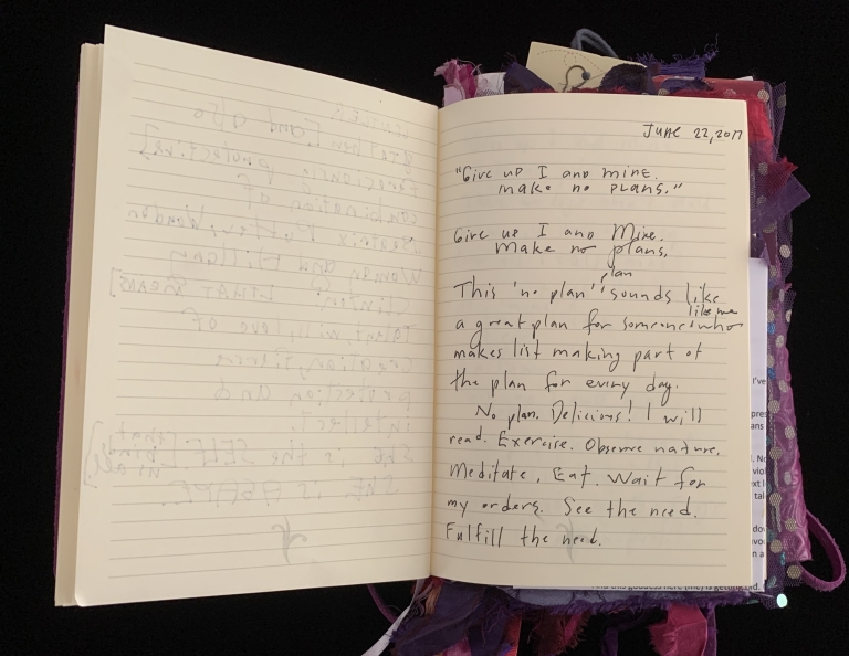 - Purple; Prince; June 7; Blank journal; Barnes and Noble; 2016–2017; Trump election; 29 Pieces; Funding crisis; Board realities; Come to Jesus moment; Remote work; Gut punches; Dana moves; Emotional loss; Political uncertainty; Life necessities; Calling the angels; Unshakeable faith; State of Contentment; Sacred feminine; Tramadol; Pleasing Daddy; Embodying HER; Yayoi Kusama; Frida Kahlo; Missing Barbara Boster; Mantrams for Trump; Anger chart; Charlottesville; Compassionate Path; Critical Path; Chronic hip pain; Angst and joy; Friendship and forgiveness; NYC trip; Times Square BID; Women artists; Left vs. right hand writing; No backyard studio