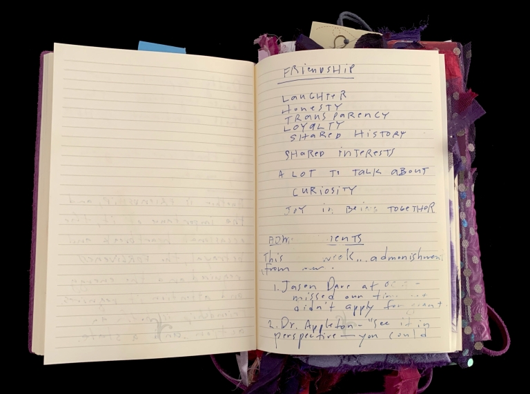 - Purple; Prince; June 7; Blank journal; Barnes and Noble; 2016–2017; Trump election; 29 Pieces; Funding crisis; Board realities; Come to Jesus moment; Remote work; Gut punches; Dana moves; Emotional loss; Political uncertainty; Life necessities; Calling the angels; Unshakeable faith; State of Contentment; Sacred feminine; Tramadol; Pleasing Daddy; Embodying HER; Yayoi Kusama; Frida Kahlo; Missing Barbara Boster; Mantrams for Trump; Anger chart; Charlottesville; Compassionate Path; Critical Path; Chronic hip pain; Angst and joy; Friendship and forgiveness; NYC trip; Times Square BID; Women artists; Left vs. right hand writing; No backyard studio