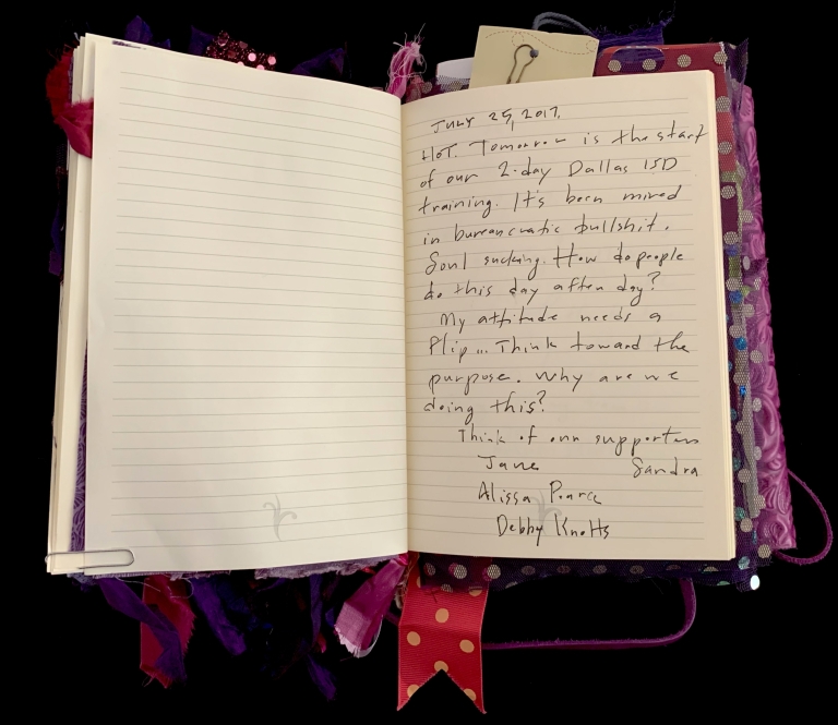 - Purple; Prince; June 7; Blank journal; Barnes and Noble; 2016–2017; Trump election; 29 Pieces; Funding crisis; Board realities; Come to Jesus moment; Remote work; Gut punches; Dana moves; Emotional loss; Political uncertainty; Life necessities; Calling the angels; Unshakeable faith; State of Contentment; Sacred feminine; Tramadol; Pleasing Daddy; Embodying HER; Yayoi Kusama; Frida Kahlo; Missing Barbara Boster; Mantrams for Trump; Anger chart; Charlottesville; Compassionate Path; Critical Path; Chronic hip pain; Angst and joy; Friendship and forgiveness; NYC trip; Times Square BID; Women artists; Left vs. right hand writing; No backyard studio