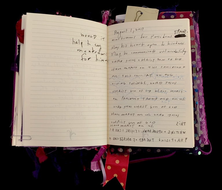 - Purple; Prince; June 7; Blank journal; Barnes and Noble; 2016–2017; Trump election; 29 Pieces; Funding crisis; Board realities; Come to Jesus moment; Remote work; Gut punches; Dana moves; Emotional loss; Political uncertainty; Life necessities; Calling the angels; Unshakeable faith; State of Contentment; Sacred feminine; Tramadol; Pleasing Daddy; Embodying HER; Yayoi Kusama; Frida Kahlo; Missing Barbara Boster; Mantrams for Trump; Anger chart; Charlottesville; Compassionate Path; Critical Path; Chronic hip pain; Angst and joy; Friendship and forgiveness; NYC trip; Times Square BID; Women artists; Left vs. right hand writing; No backyard studio