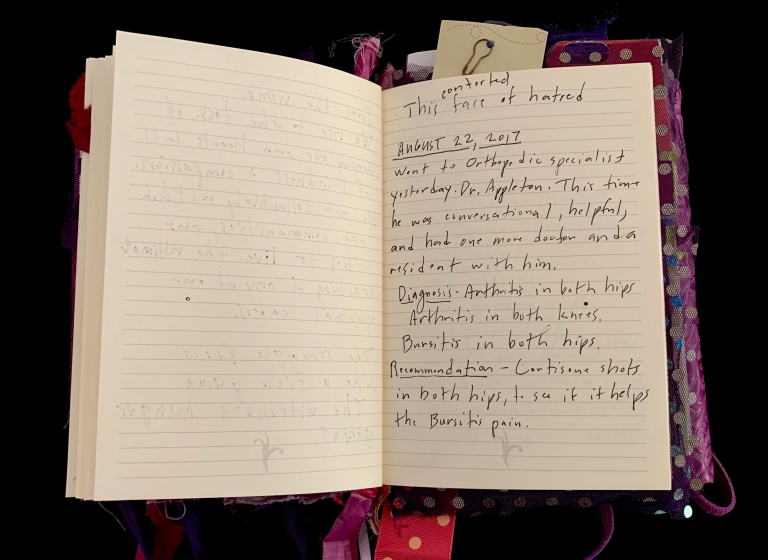 - Purple; Prince; June 7; Blank journal; Barnes and Noble; 2016–2017; Trump election; 29 Pieces; Funding crisis; Board realities; Come to Jesus moment; Remote work; Gut punches; Dana moves; Emotional loss; Political uncertainty; Life necessities; Calling the angels; Unshakeable faith; State of Contentment; Sacred feminine; Tramadol; Pleasing Daddy; Embodying HER; Yayoi Kusama; Frida Kahlo; Missing Barbara Boster; Mantrams for Trump; Anger chart; Charlottesville; Compassionate Path; Critical Path; Chronic hip pain; Angst and joy; Friendship and forgiveness; NYC trip; Times Square BID; Women artists; Left vs. right hand writing; No backyard studio
