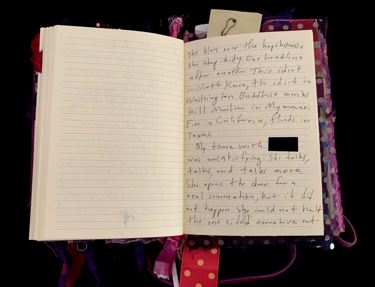 - Purple; Prince; June 7; Blank journal; Barnes and Noble; 2016–2017; Trump election; 29 Pieces; Funding crisis; Board realities; Come to Jesus moment; Remote work; Gut punches; Dana moves; Emotional loss; Political uncertainty; Life necessities; Calling the angels; Unshakeable faith; State of Contentment; Sacred feminine; Tramadol; Pleasing Daddy; Embodying HER; Yayoi Kusama; Frida Kahlo; Missing Barbara Boster; Mantrams for Trump; Anger chart; Charlottesville; Compassionate Path; Critical Path; Chronic hip pain; Angst and joy; Friendship and forgiveness; NYC trip; Times Square BID; Women artists; Left vs. right hand writing; No backyard studio