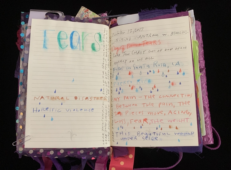 - Purple; Prince; June 7; Blank journal; Barnes and Noble; 2016–2017; Trump election; 29 Pieces; Funding crisis; Board realities; Come to Jesus moment; Remote work; Gut punches; Dana moves; Emotional loss; Political uncertainty; Life necessities; Calling the angels; Unshakeable faith; State of Contentment; Sacred feminine; Tramadol; Pleasing Daddy; Embodying HER; Yayoi Kusama; Frida Kahlo; Missing Barbara Boster; Mantrams for Trump; Anger chart; Charlottesville; Compassionate Path; Critical Path; Chronic hip pain; Angst and joy; Friendship and forgiveness; NYC trip; Times Square BID; Women artists; Left vs. right hand writing; No backyard studio