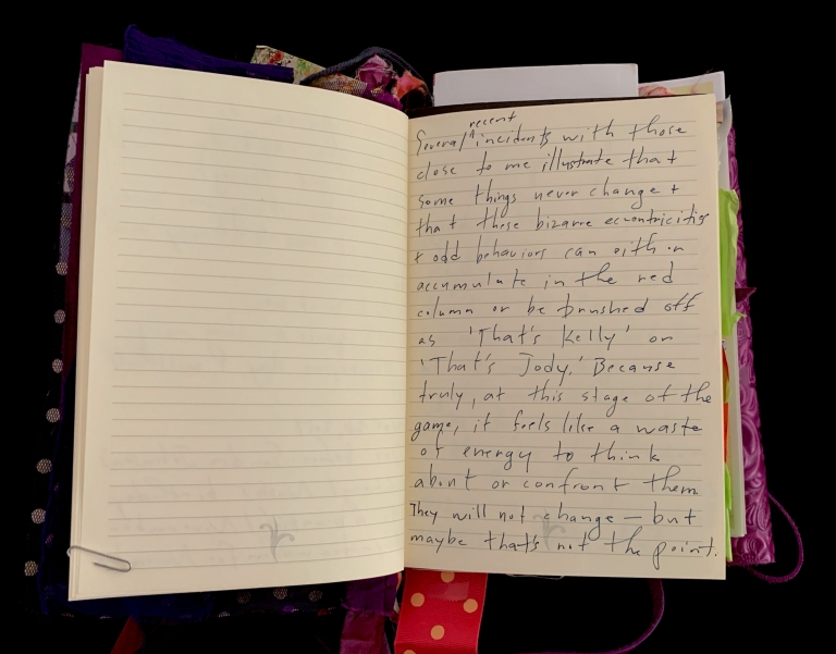 - Purple; Prince; June 7; Blank journal; Barnes and Noble; 2016–2017; Trump election; 29 Pieces; Funding crisis; Board realities; Come to Jesus moment; Remote work; Gut punches; Dana moves; Emotional loss; Political uncertainty; Life necessities; Calling the angels; Unshakeable faith; State of Contentment; Sacred feminine; Tramadol; Pleasing Daddy; Embodying HER; Yayoi Kusama; Frida Kahlo; Missing Barbara Boster; Mantrams for Trump; Anger chart; Charlottesville; Compassionate Path; Critical Path; Chronic hip pain; Angst and joy; Friendship and forgiveness; NYC trip; Times Square BID; Women artists; Left vs. right hand writing; No backyard studio