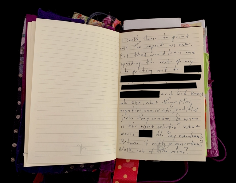 - Purple; Prince; June 7; Blank journal; Barnes and Noble; 2016–2017; Trump election; 29 Pieces; Funding crisis; Board realities; Come to Jesus moment; Remote work; Gut punches; Dana moves; Emotional loss; Political uncertainty; Life necessities; Calling the angels; Unshakeable faith; State of Contentment; Sacred feminine; Tramadol; Pleasing Daddy; Embodying HER; Yayoi Kusama; Frida Kahlo; Missing Barbara Boster; Mantrams for Trump; Anger chart; Charlottesville; Compassionate Path; Critical Path; Chronic hip pain; Angst and joy; Friendship and forgiveness; NYC trip; Times Square BID; Women artists; Left vs. right hand writing; No backyard studio