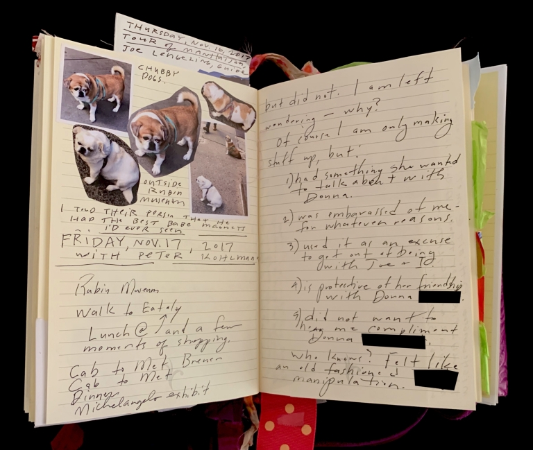 - Purple; Prince; June 7; Blank journal; Barnes and Noble; 2016–2017; Trump election; 29 Pieces; Funding crisis; Board realities; Come to Jesus moment; Remote work; Gut punches; Dana moves; Emotional loss; Political uncertainty; Life necessities; Calling the angels; Unshakeable faith; State of Contentment; Sacred feminine; Tramadol; Pleasing Daddy; Embodying HER; Yayoi Kusama; Frida Kahlo; Missing Barbara Boster; Mantrams for Trump; Anger chart; Charlottesville; Compassionate Path; Critical Path; Chronic hip pain; Angst and joy; Friendship and forgiveness; NYC trip; Times Square BID; Women artists; Left vs. right hand writing; No backyard studio