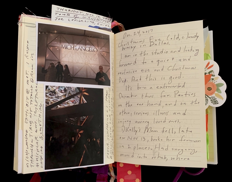 - Purple; Prince; June 7; Blank journal; Barnes and Noble; 2016–2017; Trump election; 29 Pieces; Funding crisis; Board realities; Come to Jesus moment; Remote work; Gut punches; Dana moves; Emotional loss; Political uncertainty; Life necessities; Calling the angels; Unshakeable faith; State of Contentment; Sacred feminine; Tramadol; Pleasing Daddy; Embodying HER; Yayoi Kusama; Frida Kahlo; Missing Barbara Boster; Mantrams for Trump; Anger chart; Charlottesville; Compassionate Path; Critical Path; Chronic hip pain; Angst and joy; Friendship and forgiveness; NYC trip; Times Square BID; Women artists; Left vs. right hand writing; No backyard studio
